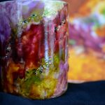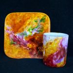Assiette en porcelaine peinte, de 21 par 21 cm, recouverte de protection alimentaire.