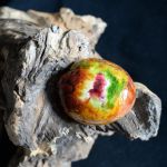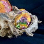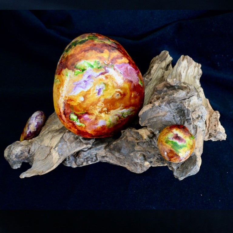 Installation de trois pierres peintes sur souche de bois.
