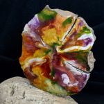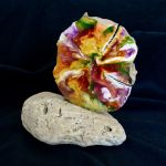 Installation de galet brut et tranche de bois peint d'un seul côté, laissant le bois brut poli sur le verso. Format 20/13/10 cm environ.