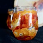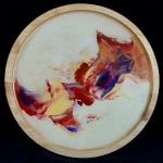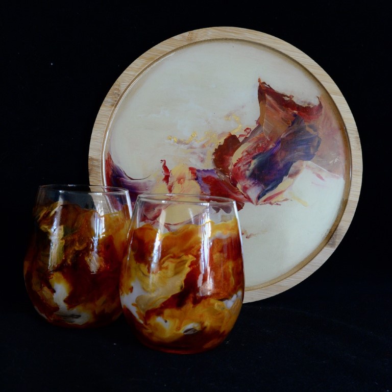 Ensemble composé d'une assiette en bambou (diamèttre 24 cm, peinte à l'acrylique et protégée d'un revêtement alimentaire), et de deux verres peints.